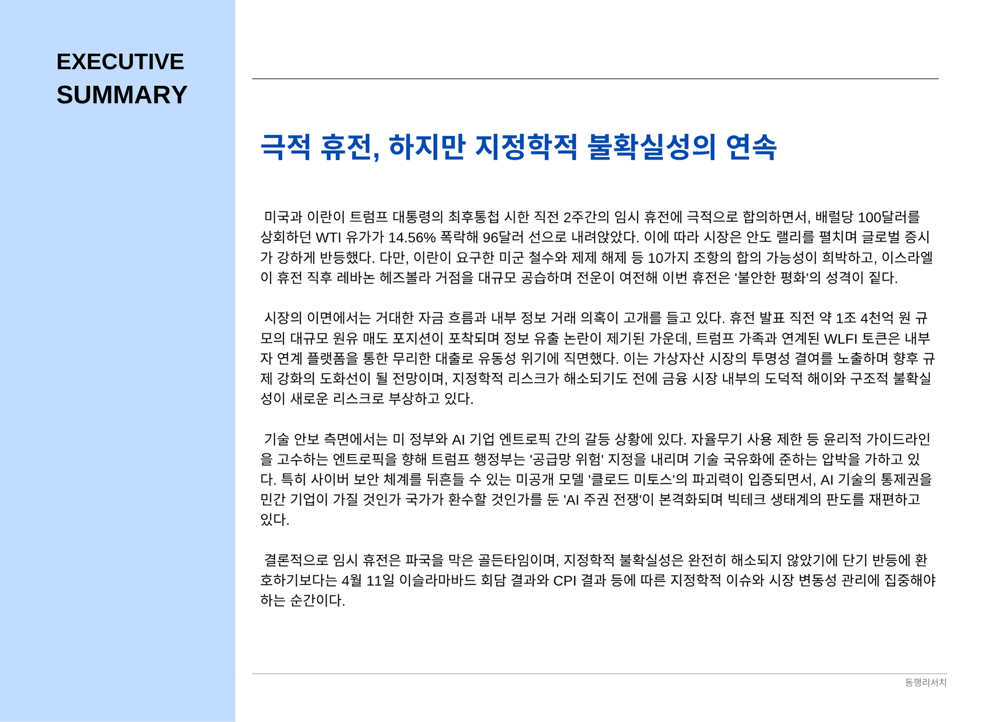 [2026.4.10] 글로벌 자산 포트폴리오 전략 - 극적 휴전, 하지만 지정학적 불확실성의 연속